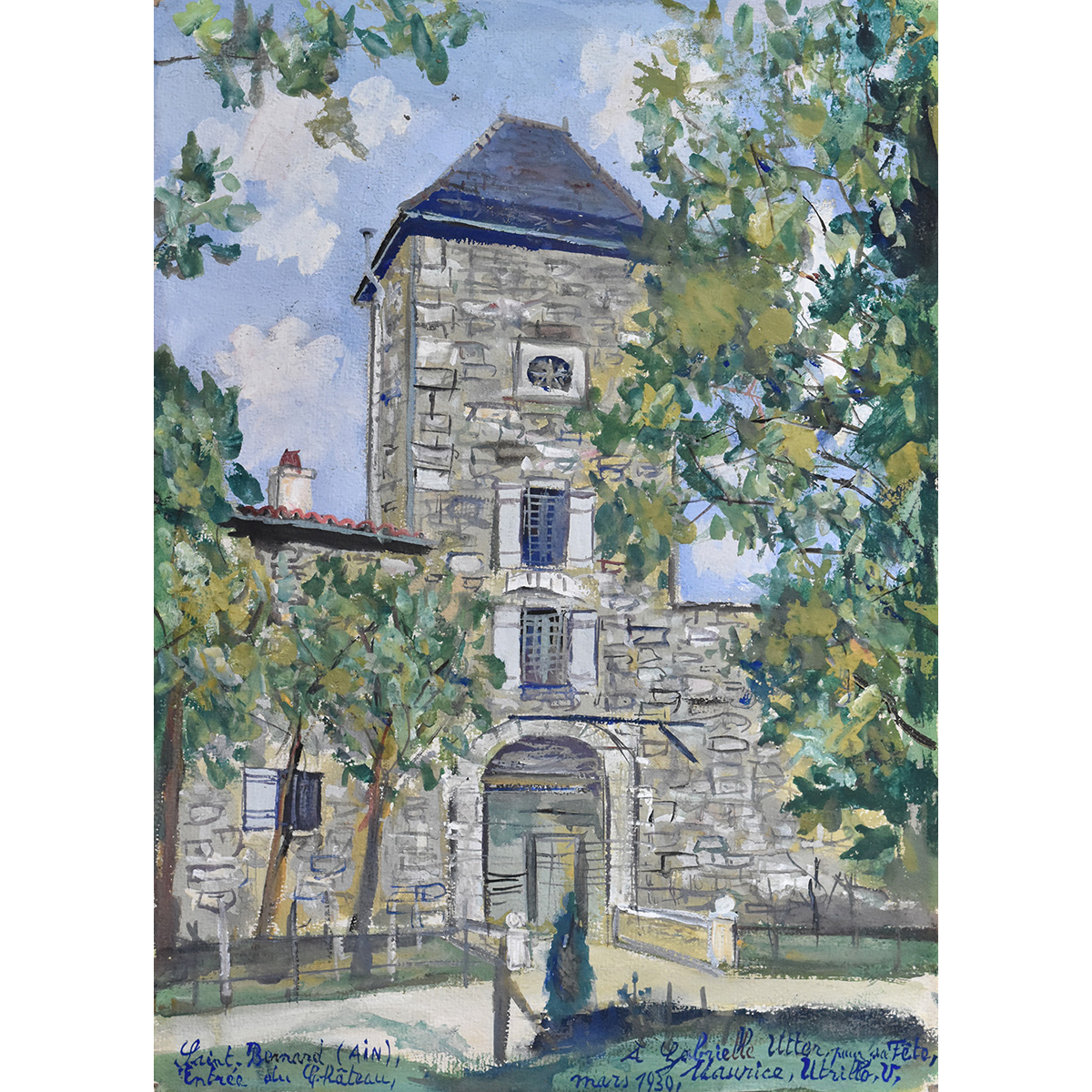 Signée et datée avec un envoi en bas à droite : À Gabrielle Utter, pour sa Fête, / Maurice, Utrillo, V, / mars 1930