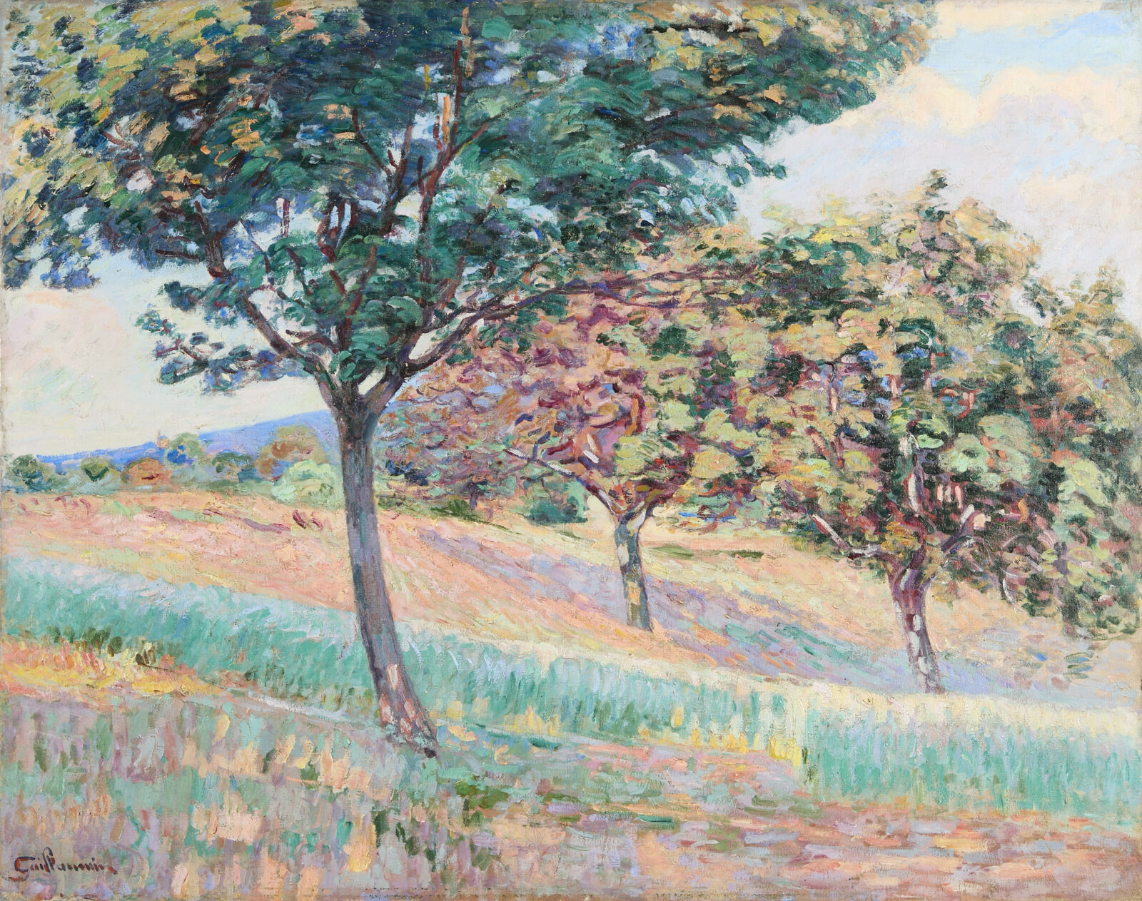 Armand Guillaumin compte parmi les impressionnistes de la première heure, ayant participé dès 1874 à la toute première exposition du groupe, dite du Salon des Refusés. Après des années difficiles, en 1891 sa situation change grâce à un gain considérable de100 000 francs or à la loterie, ce qui lui offre la liberté de voyager et de travailler avec davantage d’aisance. Au début de l’année 1893, Guillaumin revient à Paris pour la naissance de sa fille et peint régulièrement dans les environs de la capitale, notamment à Saint-Chéron. Parmi les soixante-quatre toiles présentées chez Durand-Ruel l’année suivante, douze proviennent de ce séjour à Saint-Chéron, et notre tableau peut vraisemblablement être rattaché à ce cycle. Le catalogue de l’exposition décrit la série de Saint-Chéron comme « la plus riche en effets brillants et frais, pleine de jolis sentiers ombragés, de petits ruisseaux transparents où se mirent les rives capricieuses et touffues. »