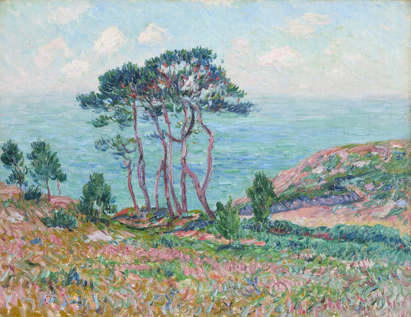 Henry Moret est un amoureux de la Bretagne et nombreux sont ses thèmes qu’on peut localiser dans le Finistère qu’il découvre en 1888 grâce à Sérusier. Ainsi que le décrivent J.-Y. Rolland et M.-B. Baranger dans leur ouvrage consacré à l’artiste (éd. Palantines, 2002), ses paysages ensoleillés de la baie de Douarnenez se confondent par leurs tons colorés et leur composition avec des tableaux de Guillaumin. « Les pins maritimes se balancent dans le vent et projettent leur sombres – curieusement cernées – sur un chemin rose ; fragmentation des touches, espaces, respiration de la toile, peu chargée. »