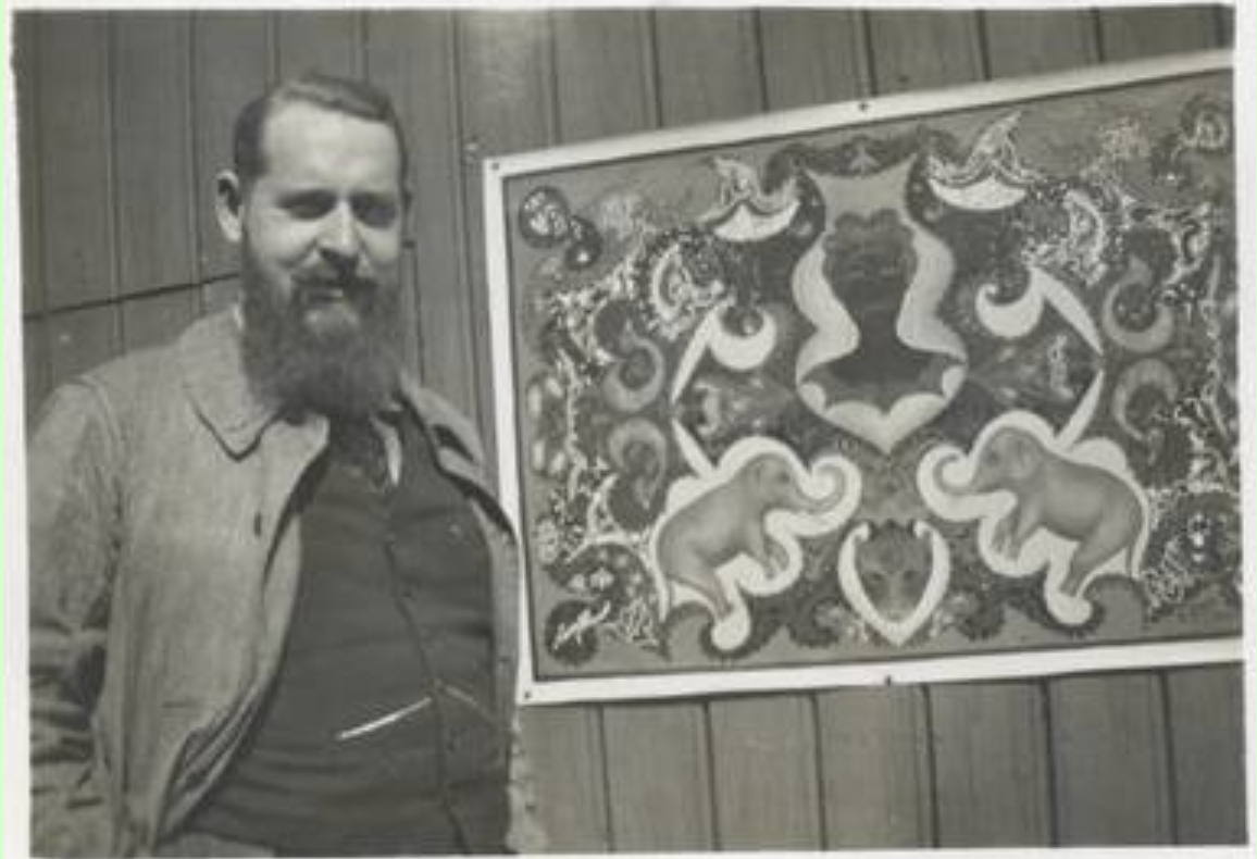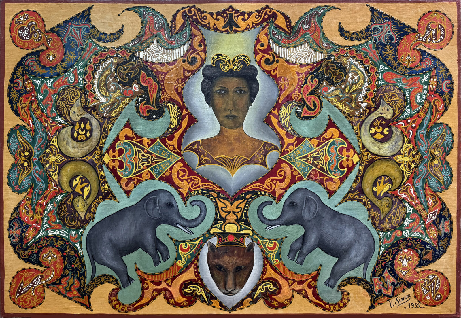 Originaire du Pas-de-Calais, peintre médiumnique, écrivain et guérisseur, Victor Simon se passionne pour la vie du Christ dès l’âge de quatorze ans, alors qu’il travaille dans les mines du Nord. En 1933, Simon est réveillé dans son sommeil par une voix qui lui demande de devenir peintre. N’ayant aucune formation artistique, il réalise sa première toile, strictement conforme aux souhaits de ses guides invisibles, dont il n’est que la main. Notre œuvre, datée de 1935, est un rare témoignage des toutes premières représentations figuratives de ce peintre-médium, mêlant des symboles ésotériques issus de toutes les religions, venus du monde invisible de l’au-delà.